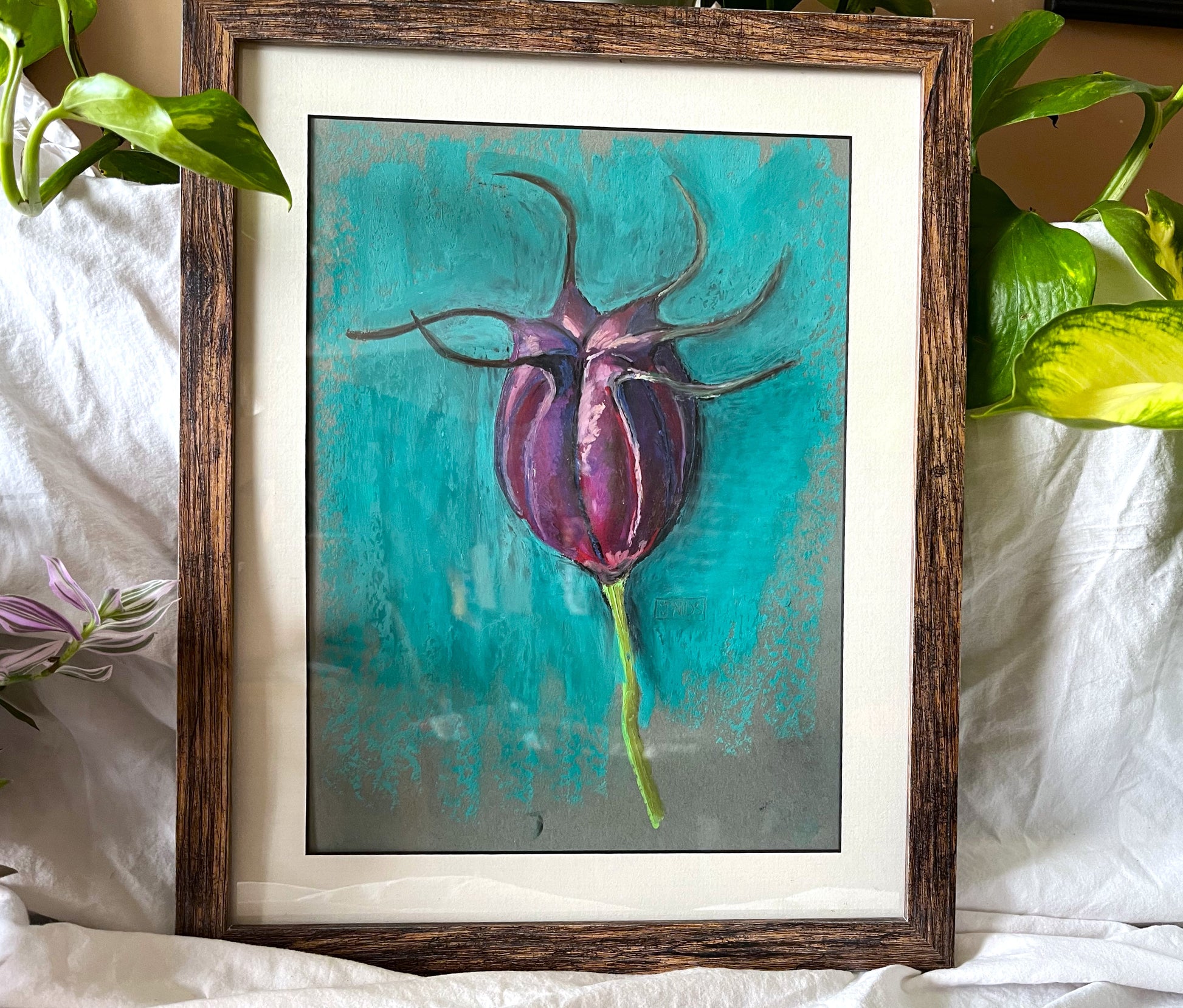 Inspired by a trip to a flower farm, this oil pastel painting print is sure to catch attention. The Devil in the bush makes for unique floral wall art with its vibrant contrasting colors.