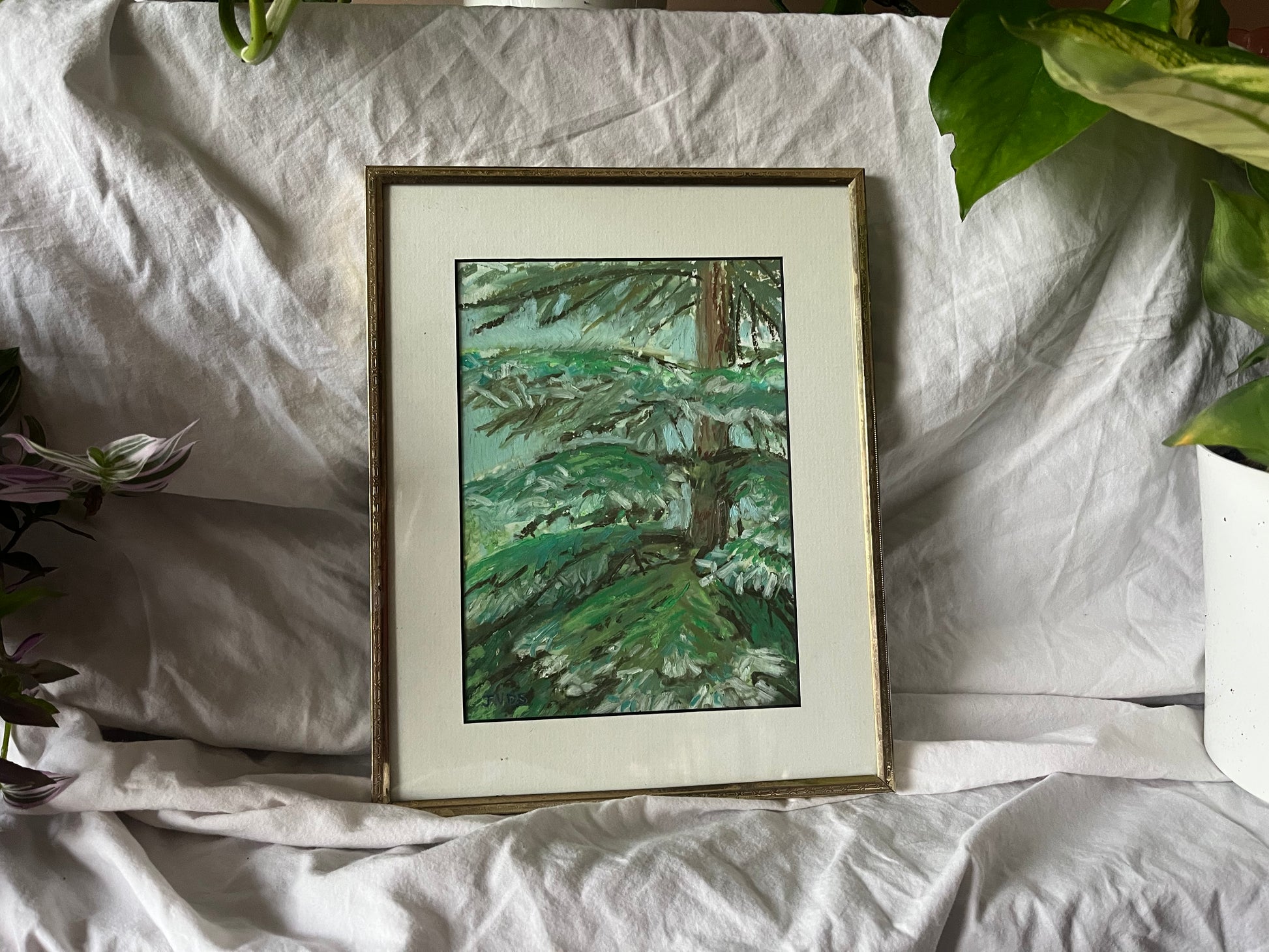Painted en plein air (outside on location) in oil pastel during a camping trip. This fine art may look abstract but look closer, its a stunning pine tree. The textured nature of oil pastel lent itself well to make this visual treat. This wall art is perfect for inviting nature into your home.